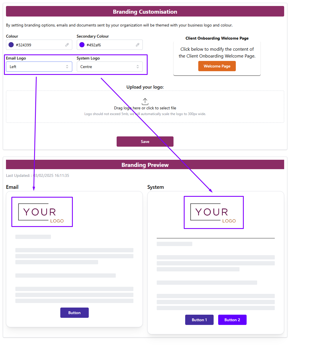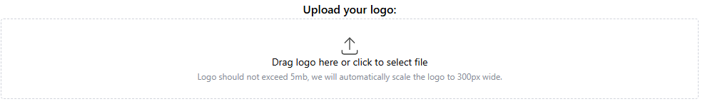 You can upload your firms logo in the Branding customisation area either by clicking on the Logo Upload area or by dragging and dropping your logo onto the Logo Upload area.