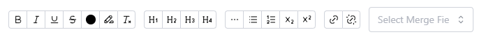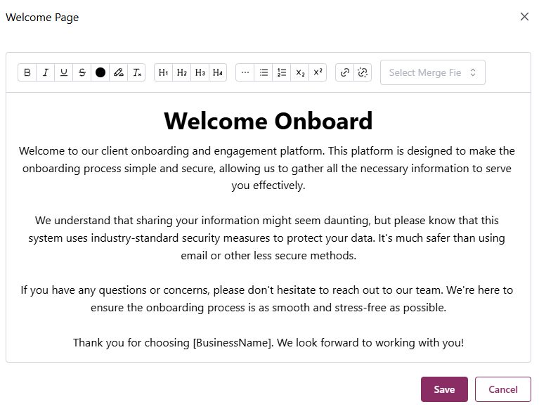 The Page Text editor allows you some rich text controls, as well as being able to add links, or adding in merge fields based on the Onboarding data.