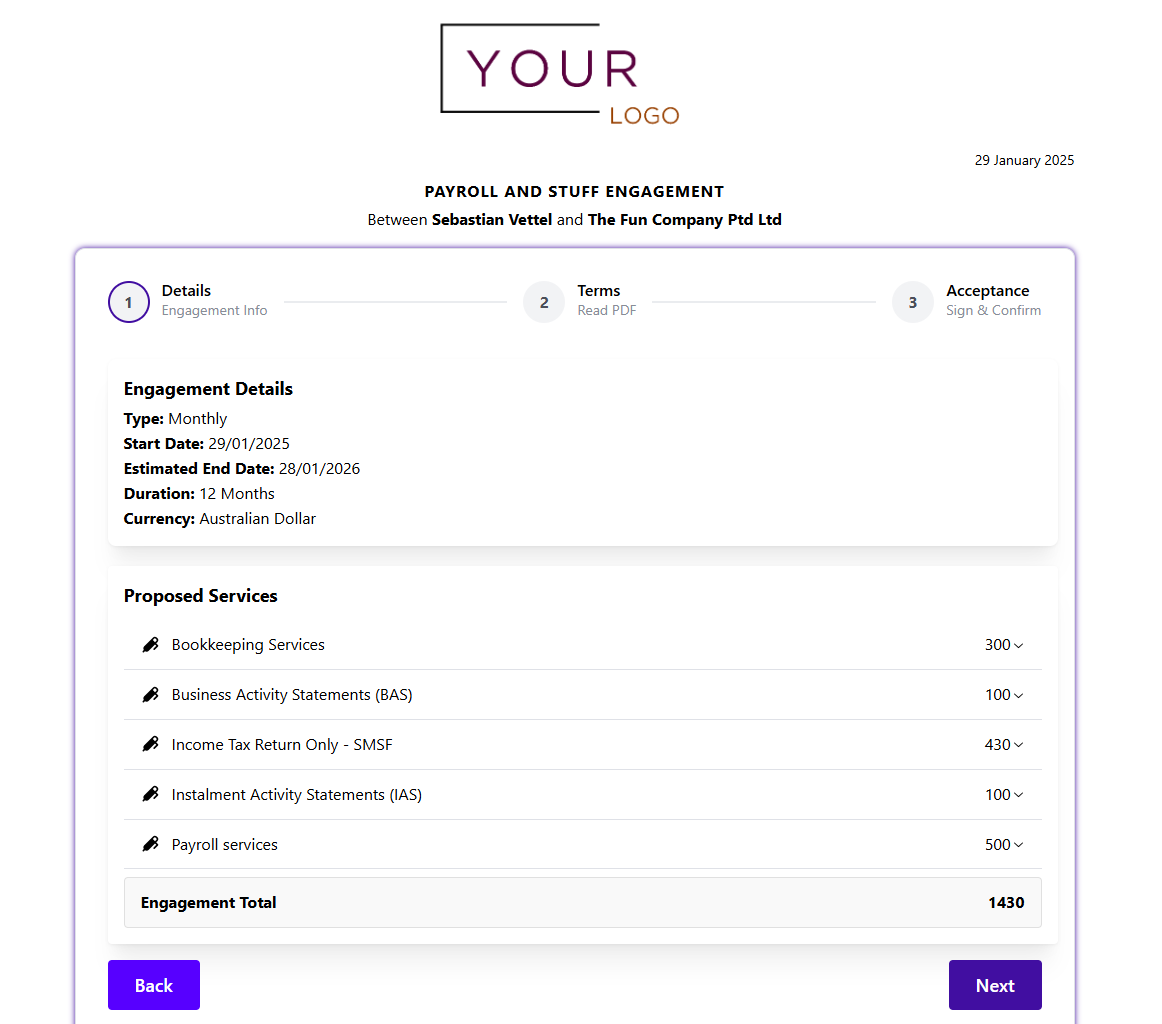 The branding colours allow you to pick a primary and secondary colour. These will be used on the Engagements, Client Onboarding and Ethical Clearances that you send out.