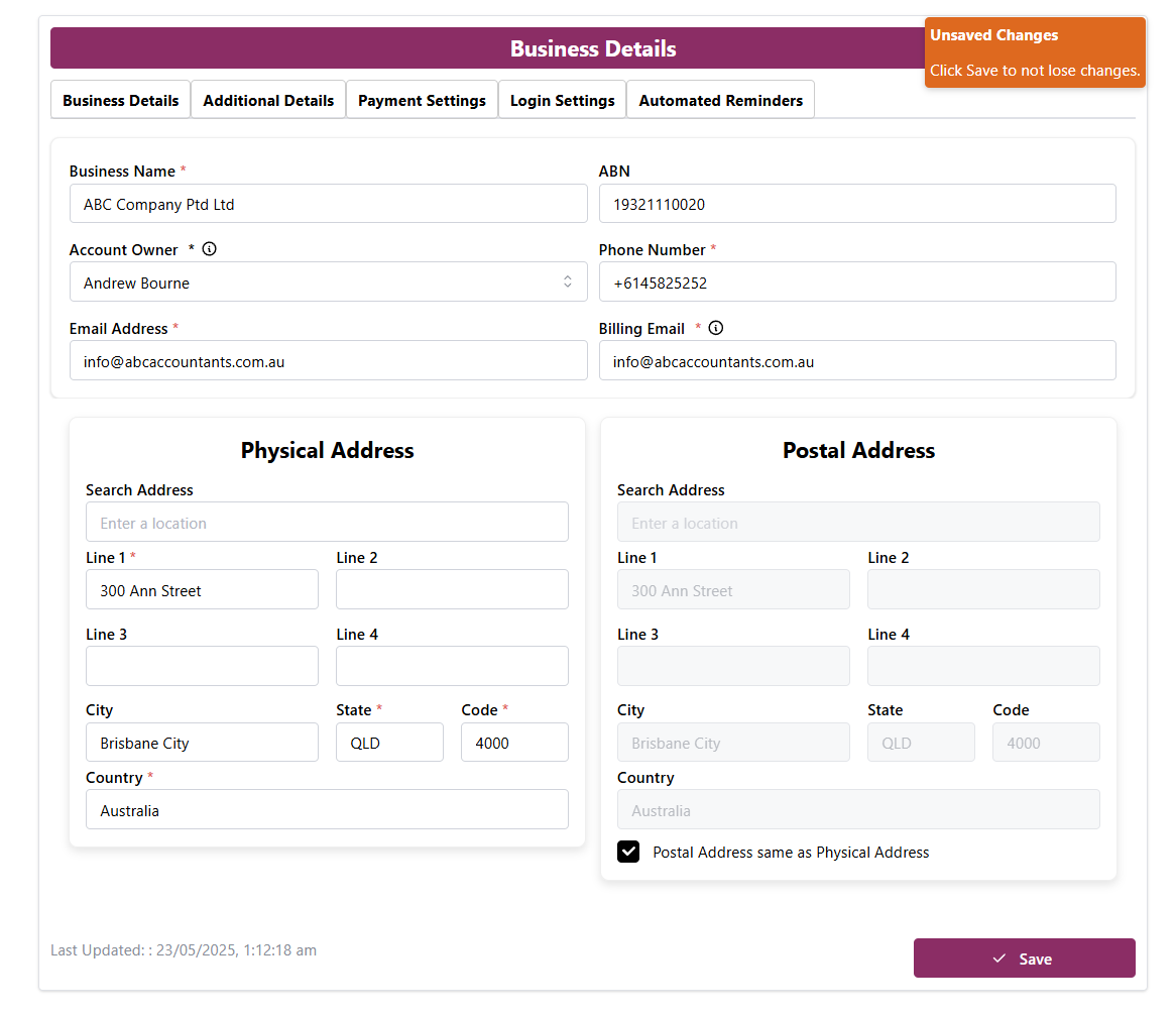 To finalise the setup your business, OnboardMe requires you to provide the relevant information on the first tab called "Business Details".