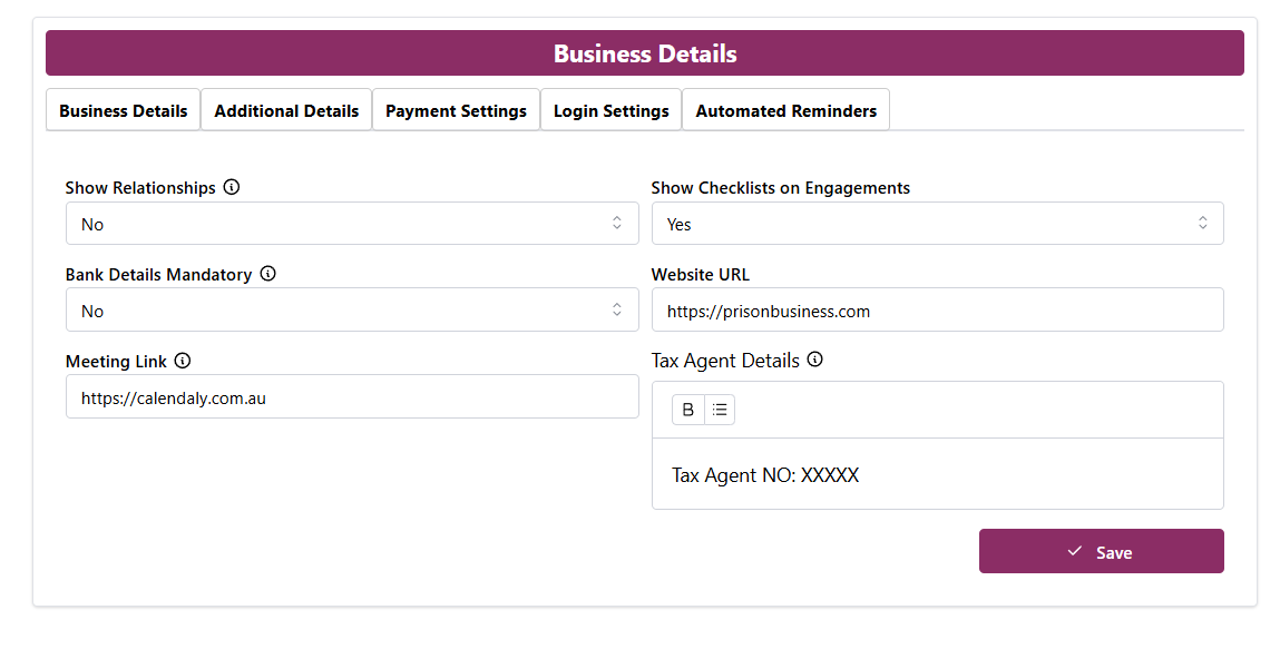 The information that you are requested to complete, will be used to create a user-friendly experience for both you and your client. Business details will be present on your onboarding, engagements, and ethical letter requests, in order for your clients to access the info, as well as to present a professional approach.