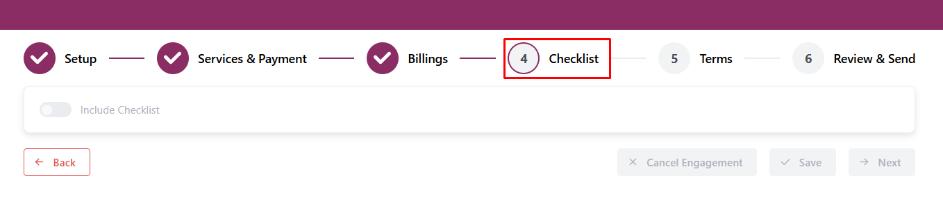The "Show Checklists on Engagements" field controls the visibility of the checklist step when setting up an Engagement. Even with this setting set to Yes, Checklists are optional on the Engagement Wizard.