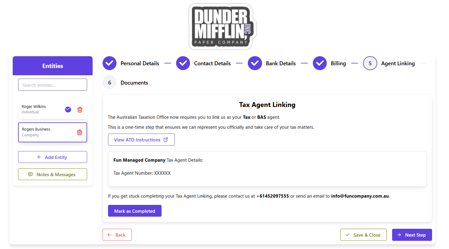 The "Tax Agent Details" field allows you to capture your Tax Agent Details which will be shown on the Client Agent linking Step on the Onboarding Wizard.