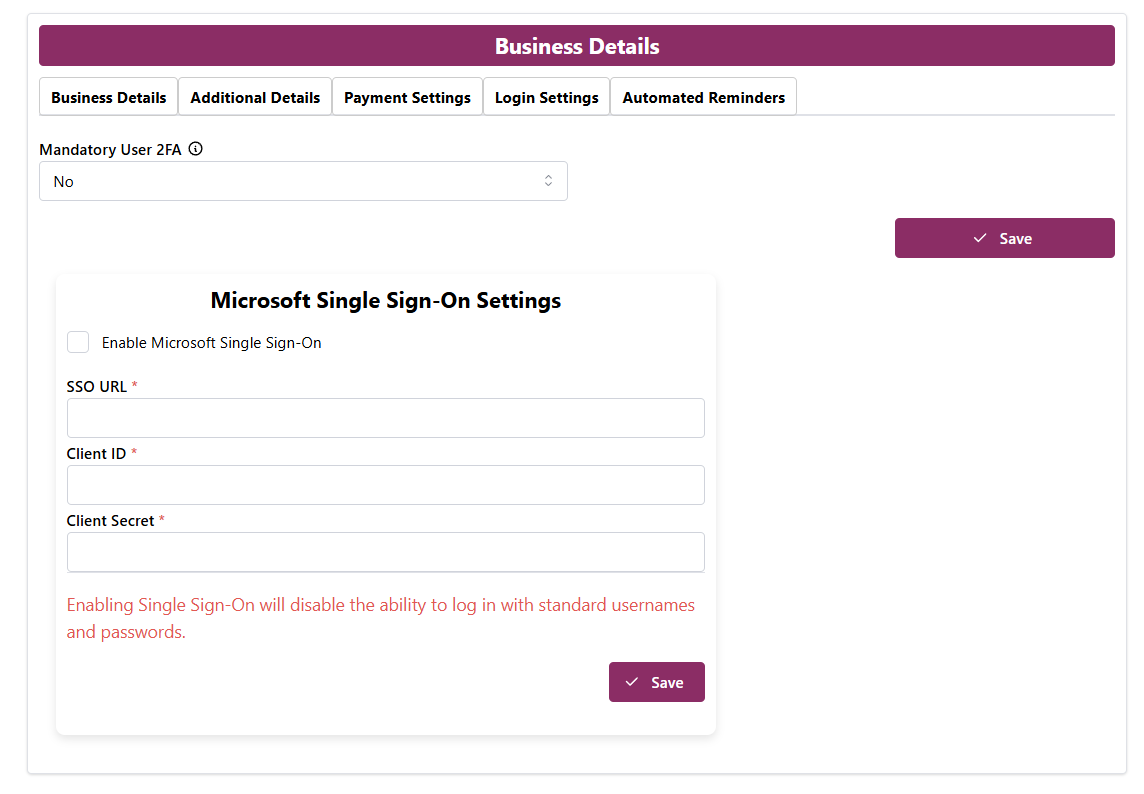 Next click on "Login Settings". Here you can configure Mandatory 2FA for users signing into your business and also setup Microsoft Single Sign-On.