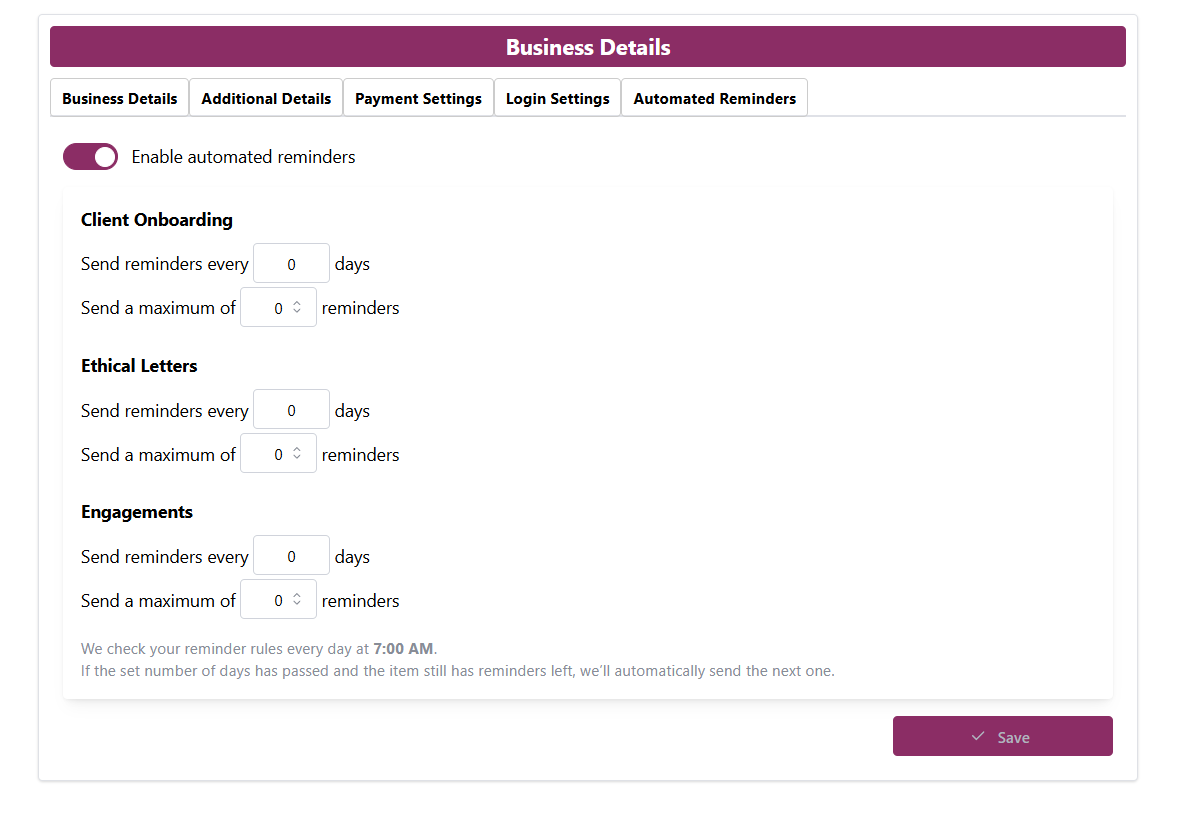 Once enabled, you will see Automated Reminder settings for Client Onboarding, Ethical Letters and Engagements.