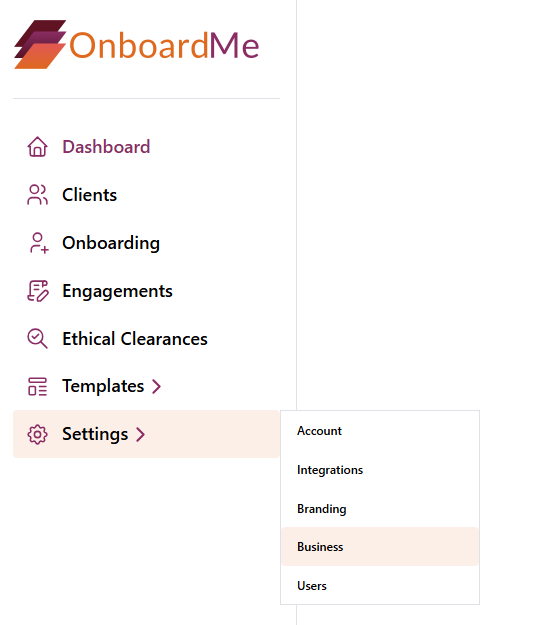 Once you have logged into your OnboardMe account, select the "Settings" option from the menu, and then click "Business".