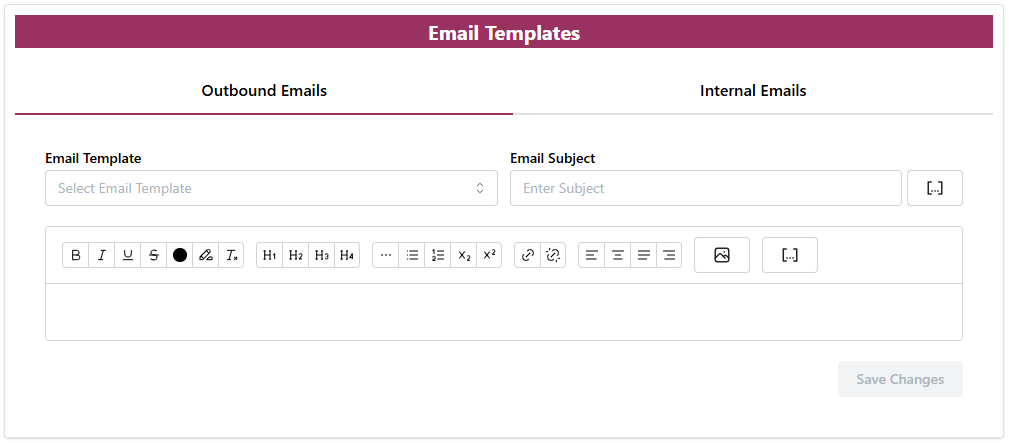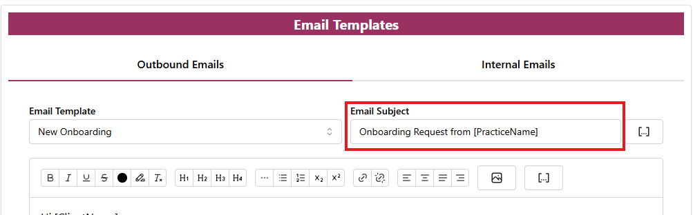 There are two sections on this page for your to customize. "Outbound emails" (sent externally to clients) and "Internal Emails" (sent within your organisation). Both sections can be customised in the same way: