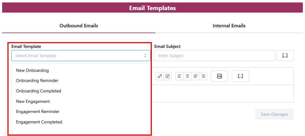 To select the template that you would like to customize, select the "Templates" option from the menu, and then click on the template type that you would like to customize, "Emails", "Engagements" or "Ethical Letters".