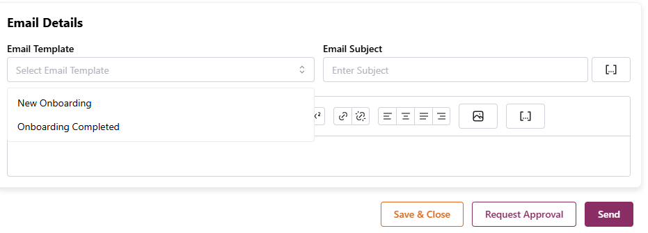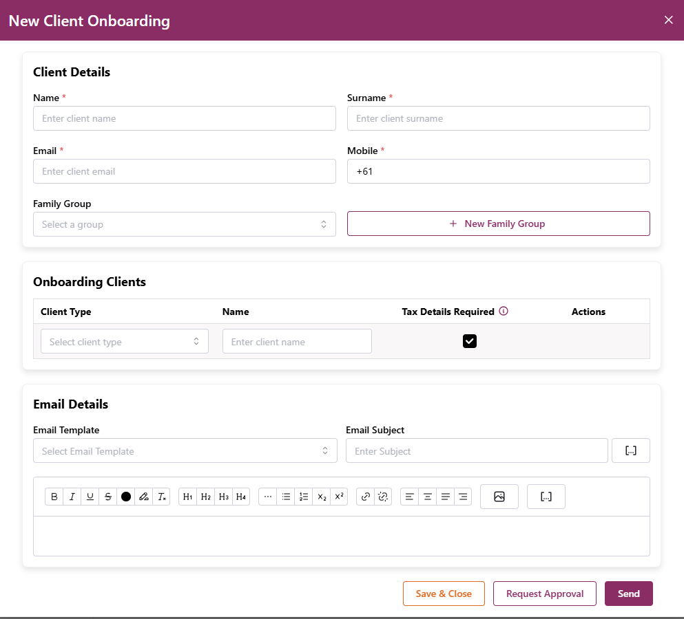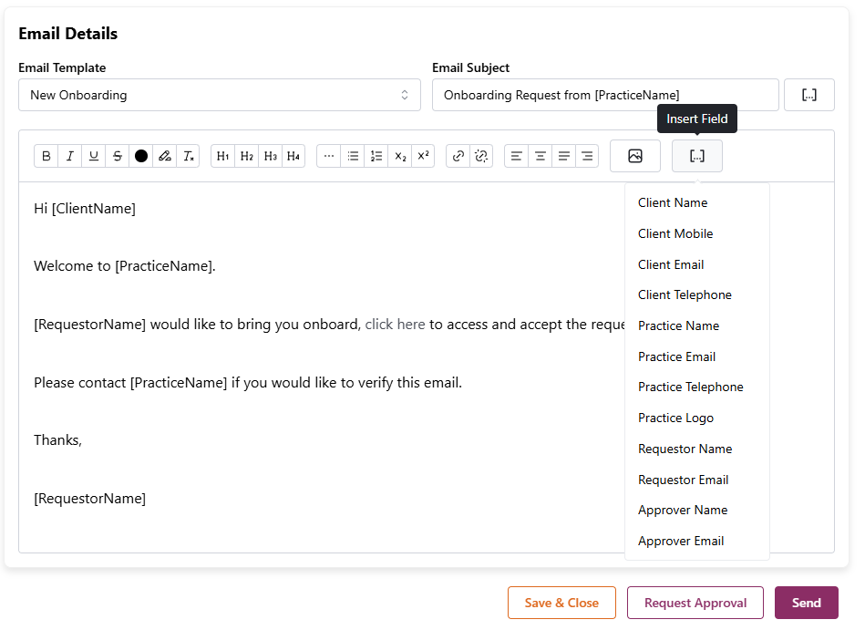 You can then edit the body of the email so that you know exactly what the client is receiving. Once your onboarding request is completed, click "send", or if it requires approval from another user, you can click "request approval" so that it is reviewed and approved before being sent to the client