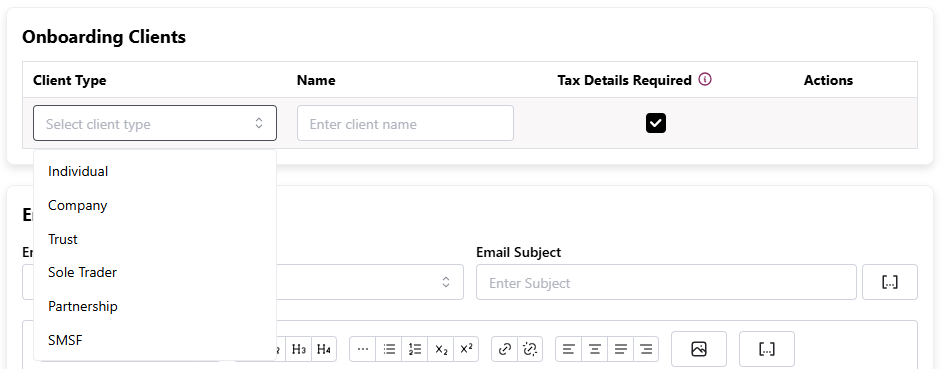 The "Onboarding Clients" section will allow you to specify the client type I.e. Individual, Company, Trust etc., and you will also be able to specify if their tax details are required.