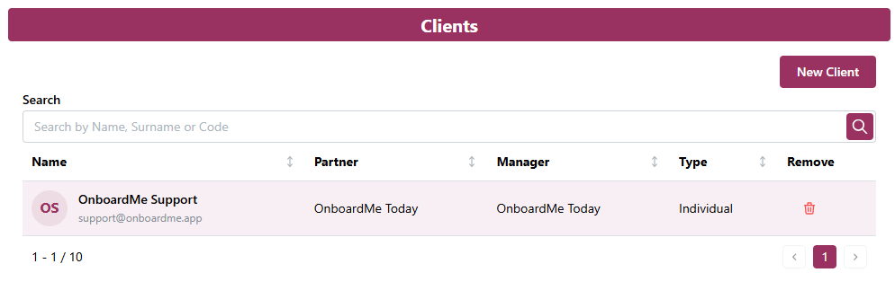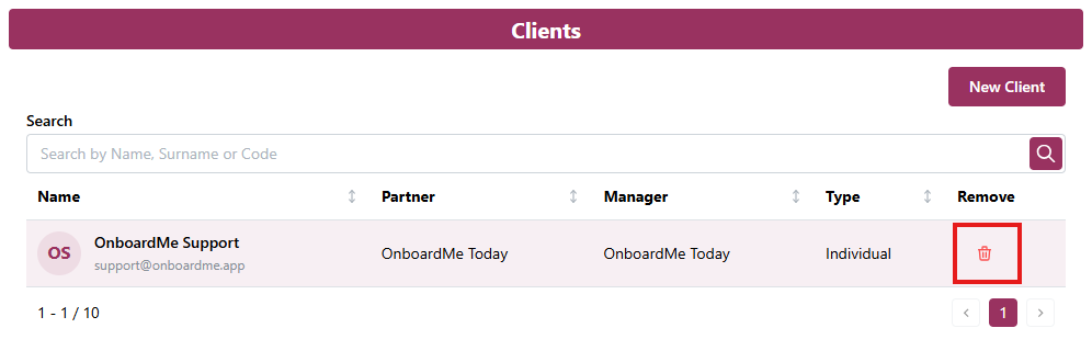 If you would like to remove a client, simply click on the red trash can icon next to the client's name, on your client list.
