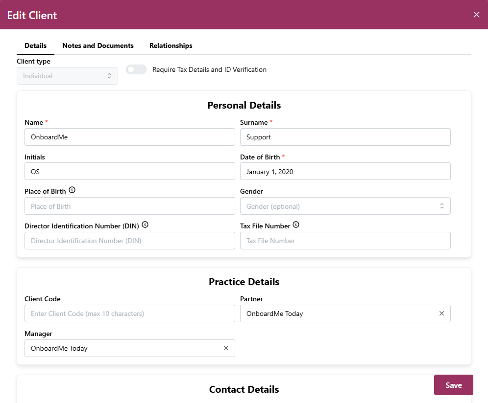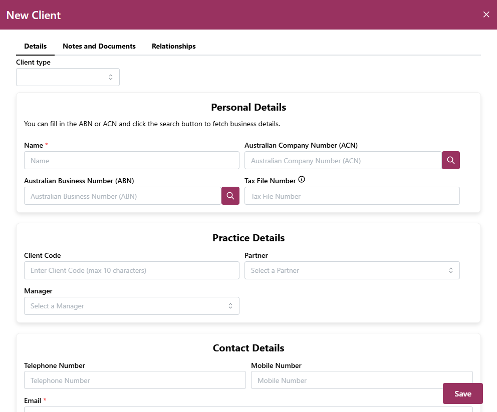 Select the client type and complete all of your client's details. Some fields are marked with a * as they are mandatory.