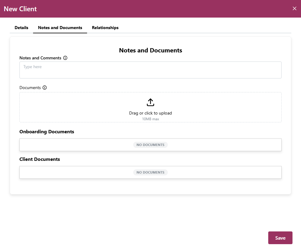 Then click on the "Notes and Documents" tab and add any notes or client documents.