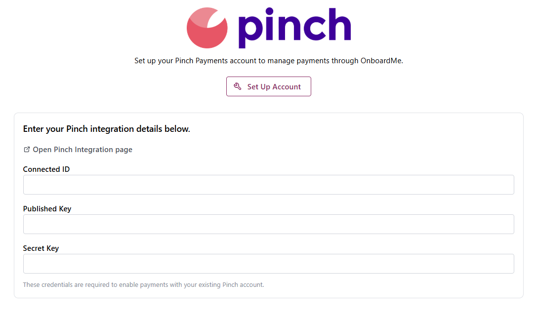 If you are an existing Pinch customer continue with this article. If you are new to Pinch, please follow this article: Enable Payments in OnboardMe for new Pinch Customers.