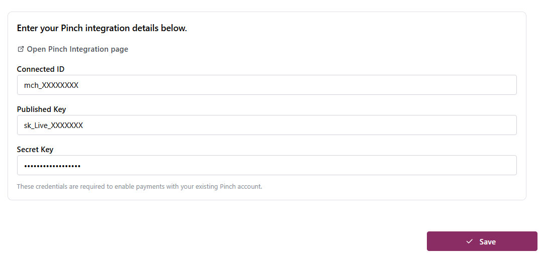 Click the Open Pinch Integration page hyperlink, this will take you to Pinch Payments to the Integrations page.