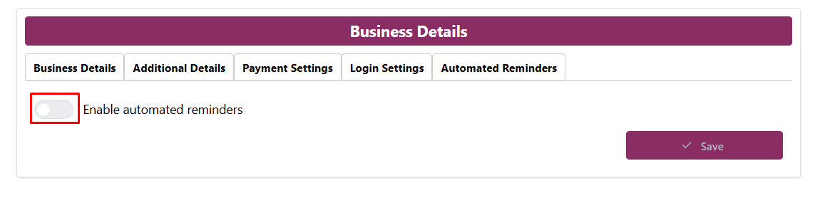 To configure Automated Reminders, click on Settings / Business and click on the Automated Reminders Tab.