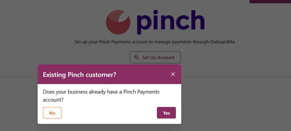 When Clicking Set Up Account, you will be asked to confirm if you are an existing Pinch Payment Customer or not.