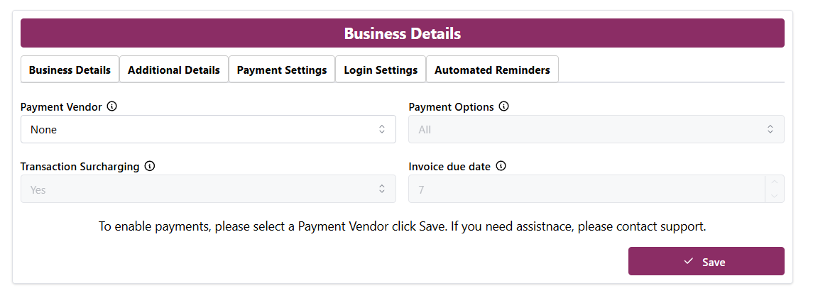 The Payment Settings screen allows you to determine if you want to accept payments in OnboardMe. All Payment Options are disabled until a Payment Vendor is selected.