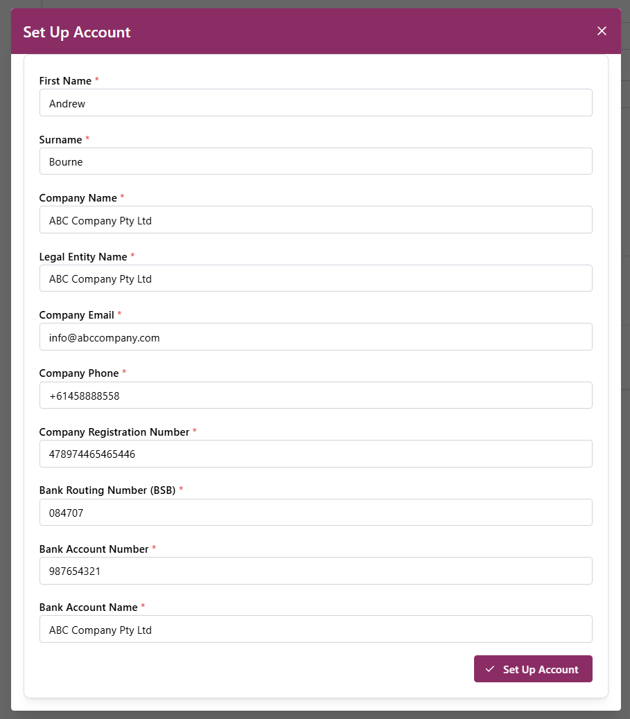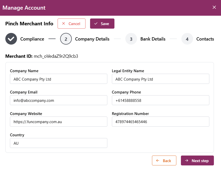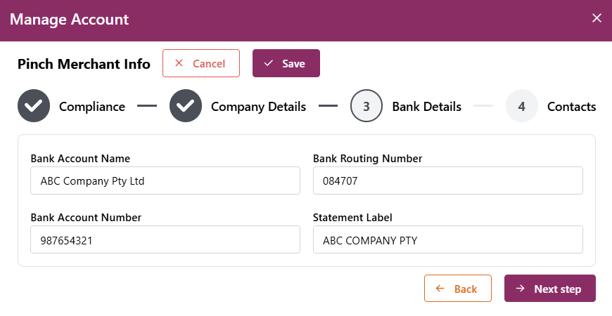 Step 3 of the wizard shows the Bank Details used when setting up the account.