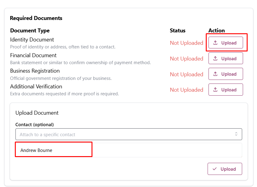 When selecting Identity Document, we will ask you which contact you wish to attach this identity document to.