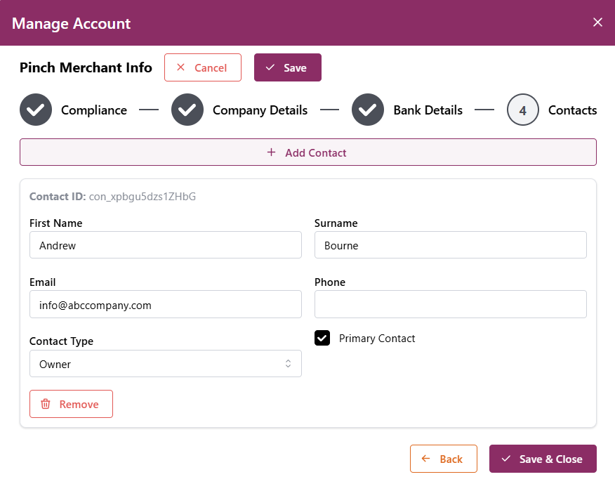 Step 4 of the wizard shows the Contacts. We automatically create an Owner contact when setting up your pinch account.