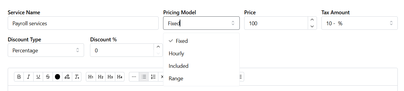 - Hourly: You can add an hourly rate for the service and optionally add a number of hours if you wish to provide a price for the service.