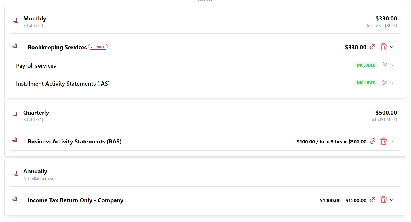 - Included: Included Services are shown on the Engagement as a sub-service of another service. This allows you to do package pricing but still list all the services and their descriptions.