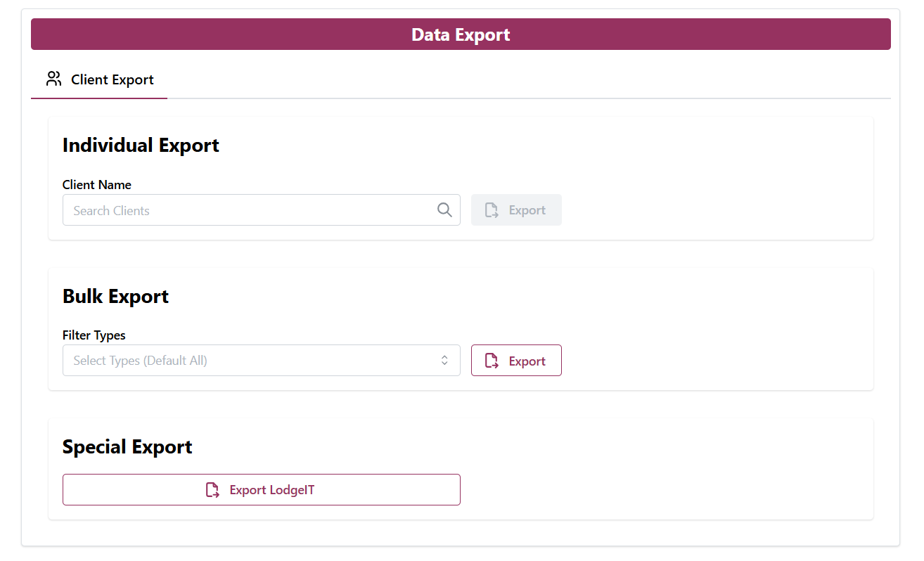 - For firms who use LodgeiT, a new Data Export function allows you to export the OnboardMe client list in the LodgeiT format which will allow you to upload newly onboarded clients into LodgeiT from OnboardMe.