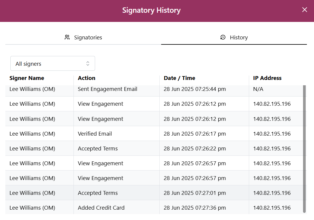 Click the History tab to view the engagement history across all signatories (use the filter to view only 1 signatories' history).