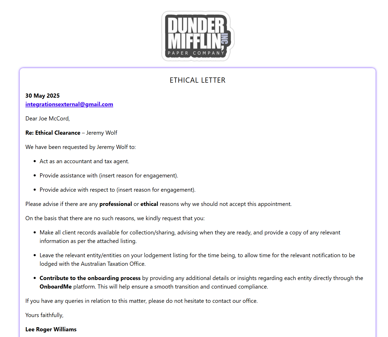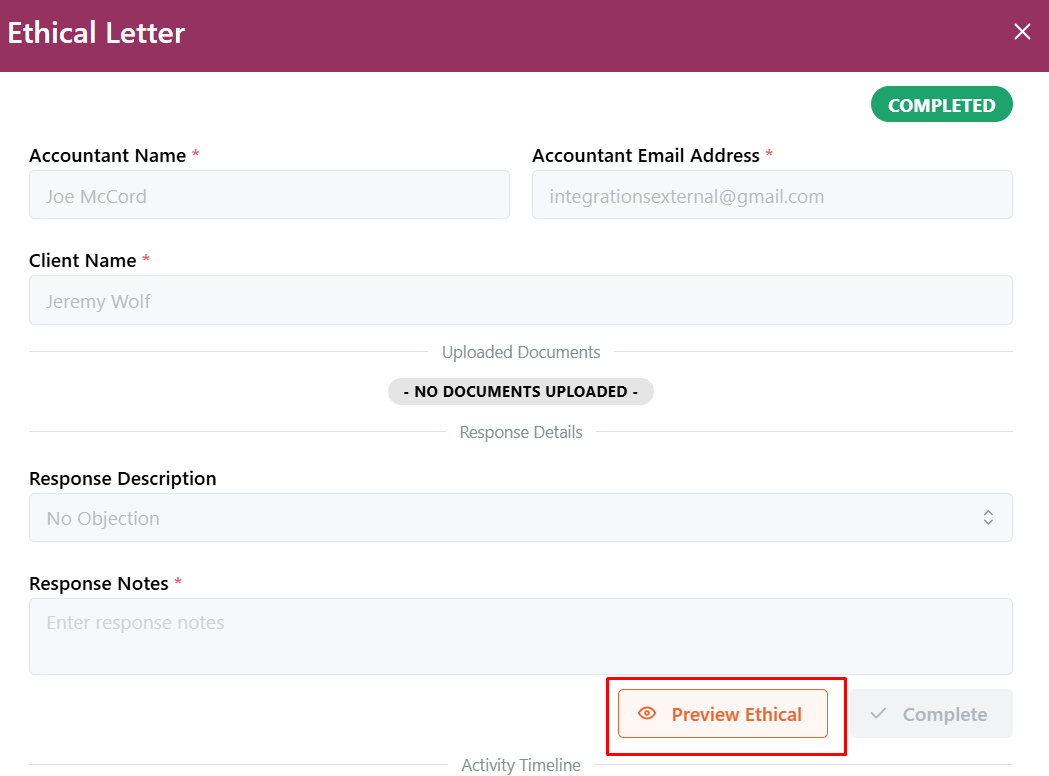- When sending an Ethical Letter, there was no way to view what the previous accountant received. We have now built an Ethical Letter Preview option which can be accessed for any saved or sent Ethical letters.
