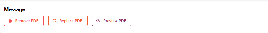 Once uploaded, the message box will be replaced with 3 buttons to Remove, Replace or Preview the uploaded PDF.