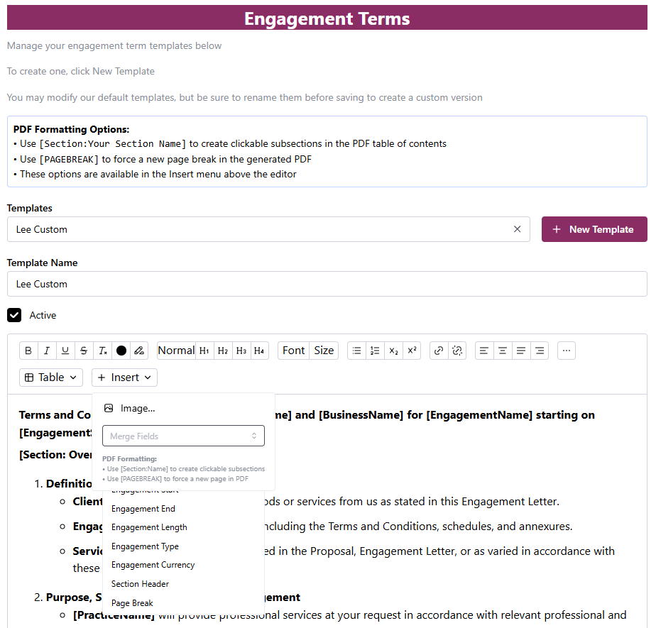 - Terms Section - A new [Section: Your Section Name] placeholder can be added to Engagements which will create subsections in the Engagement PDF.