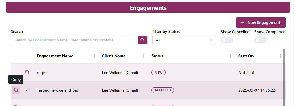 A new Copy button has been added to the Engagement and Engagement Search screens. This will copy all parts of the engagement except for Billings.