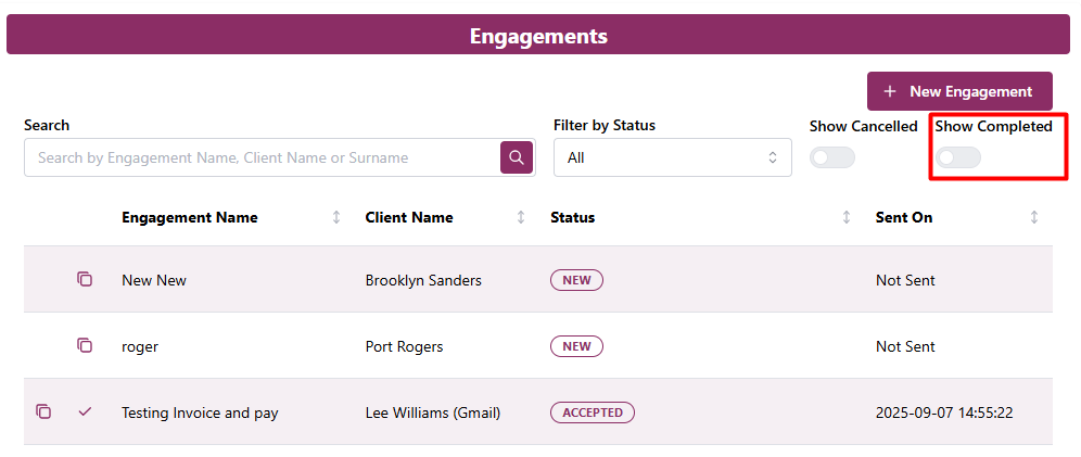 Completed Engagements are excluded from the list by default. A Show Completed option has been added to the Engagement List view to show completed items.