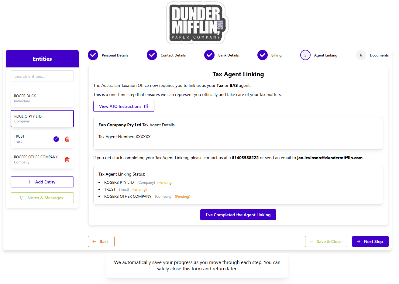 The Tax Agent Linking step has been enhanced to allow clients completing the onboarding, to flag Tax Agent Linking as complete for all required entities, instead of marking each one individually.