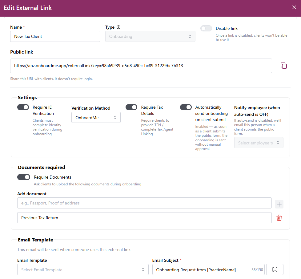 Customers who host an onboarding form on their website or would like a more hands-off way to onboard new clients can now use the new External Links feature.
