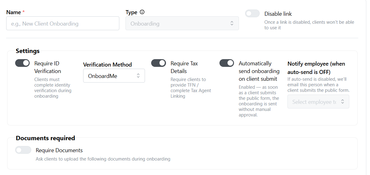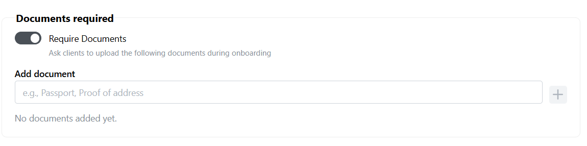 You can require the onboarding to request documents from your client during the onboarding process. Select the Require Documents switch and add the documents that you want them to upload.