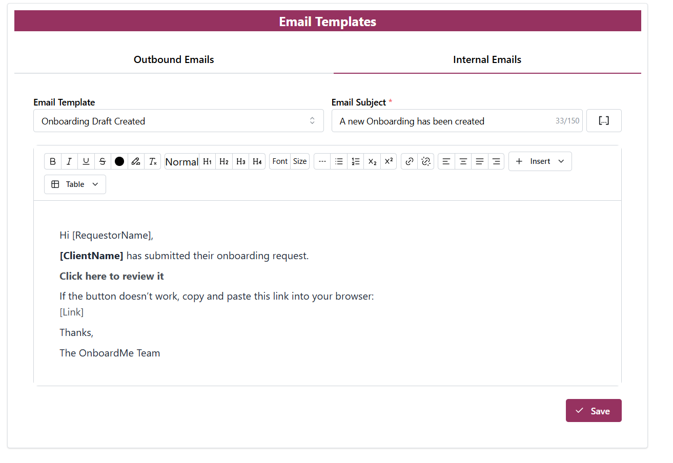 To Edit the Draft Onboarding Email sent to the nominated user, go to Templates / Emails and select Internal Emails.