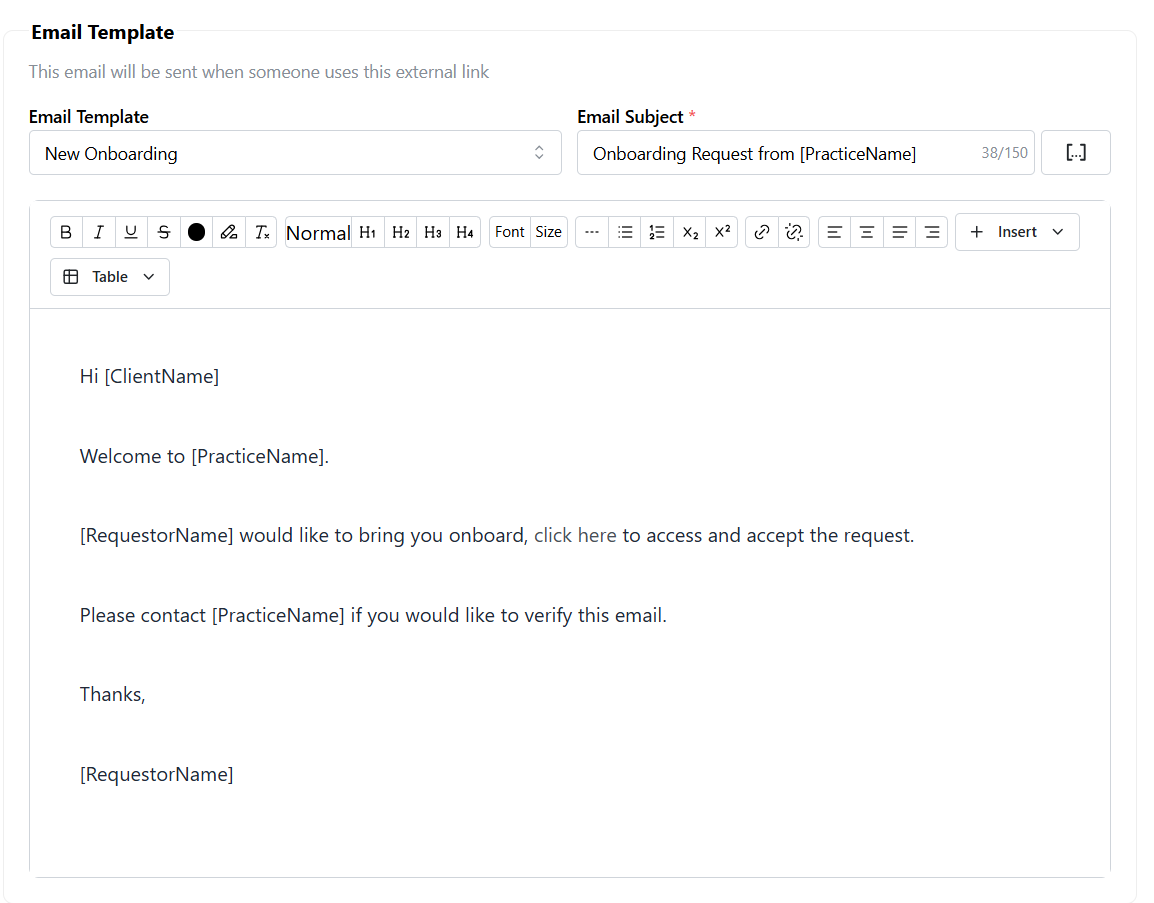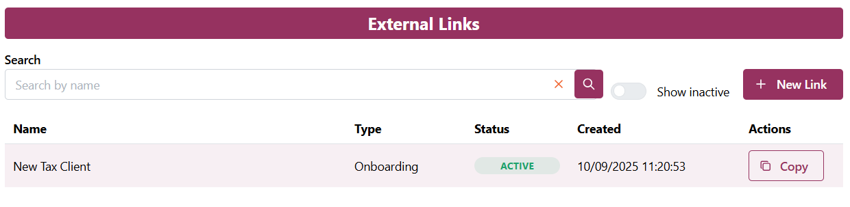 Customers who host an onboarding form on their website or would like a more hands-off way to onboard new clients can now use the new External Links feature.