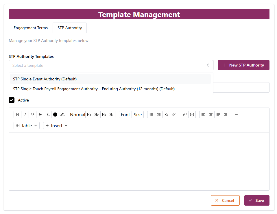 When creating a new engagement, on the Terms & Authority step, you can now (optionally) select an STP Authority Template to be included in the engagement.