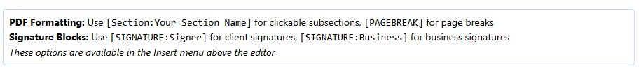 Supported Signature blocks are [SIGNATURE:Signer] and [SIGNATURE:Business].