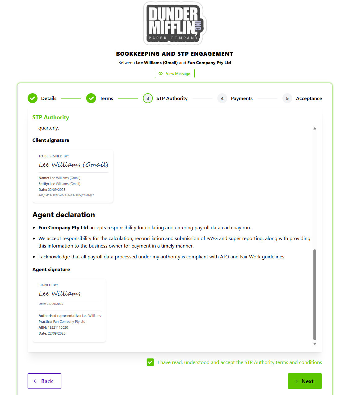 If selected, a new STP Authority step will appear in the Engagement for your client to review and accept.