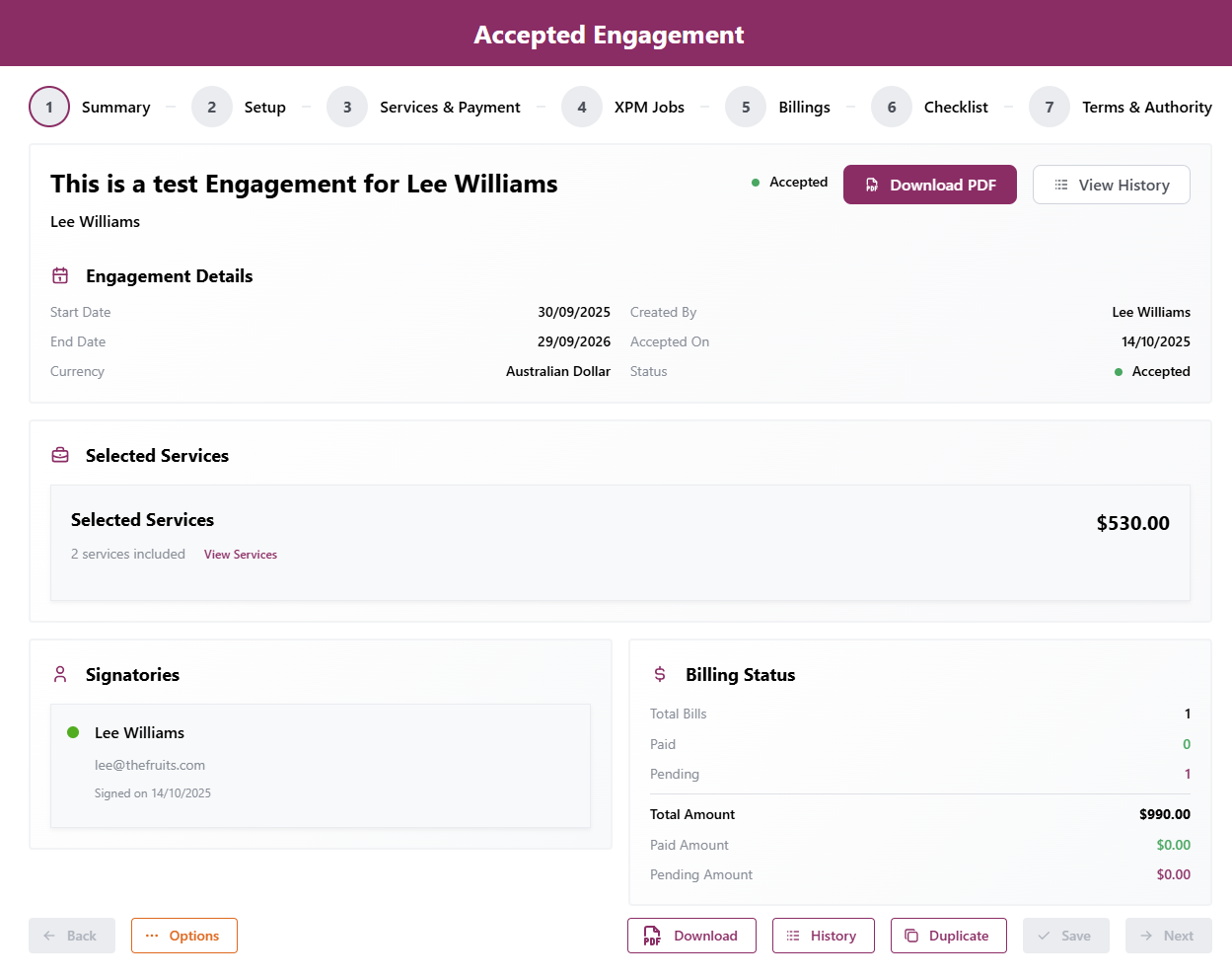 A new Engagement Summary page has been added to Accepted or Completed Engagements.
