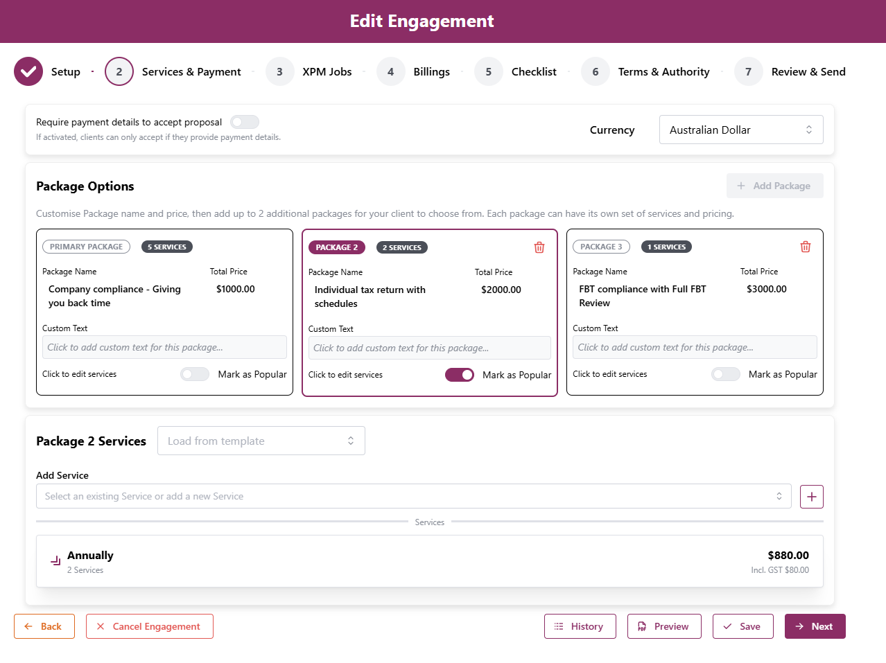 When setting up an engagement, one package will be added by default, but you can now include up to three packages for clients to choose from.