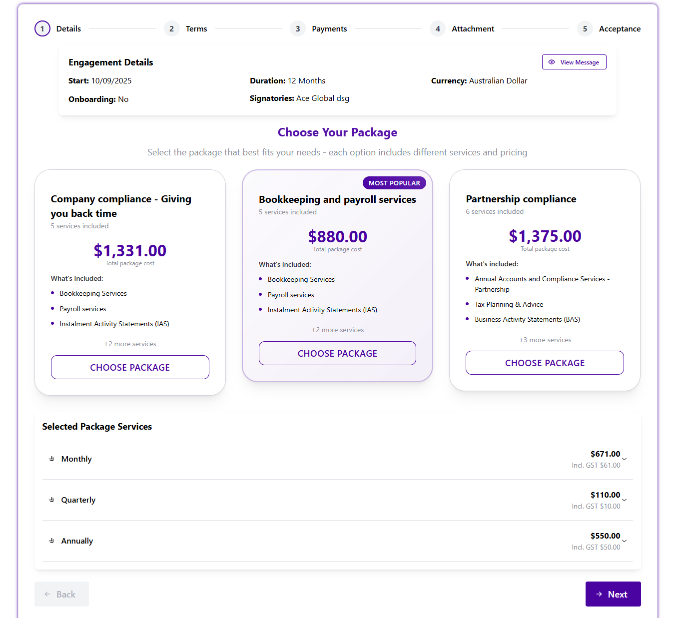 The Primary Signatory will be required to select a package before proceeding to the next step of the Engagement Acceptance process.