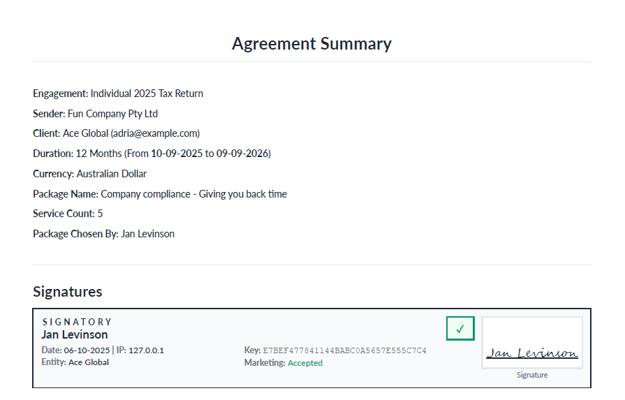 The selected package, along with the signatory’s name, will be reflected in the final PDF generated for the engagement.